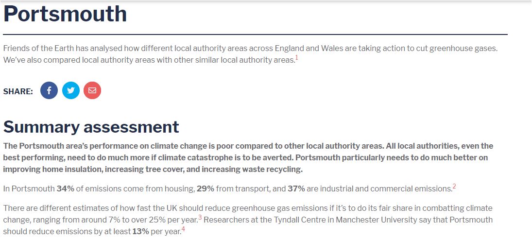 Friends of the Earth has analysed how different local authority areas across England and Wales are taking action to cut greenhouse gases. They have published a report on Portsmouth which you can read here https://takeclimateaction.uk/climate-action/how-climate-friendly-your-area-enter-your-postcode-see-results-your-community. The report includes targets for housing, transport, energy, trees, waste and divestment.
