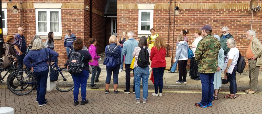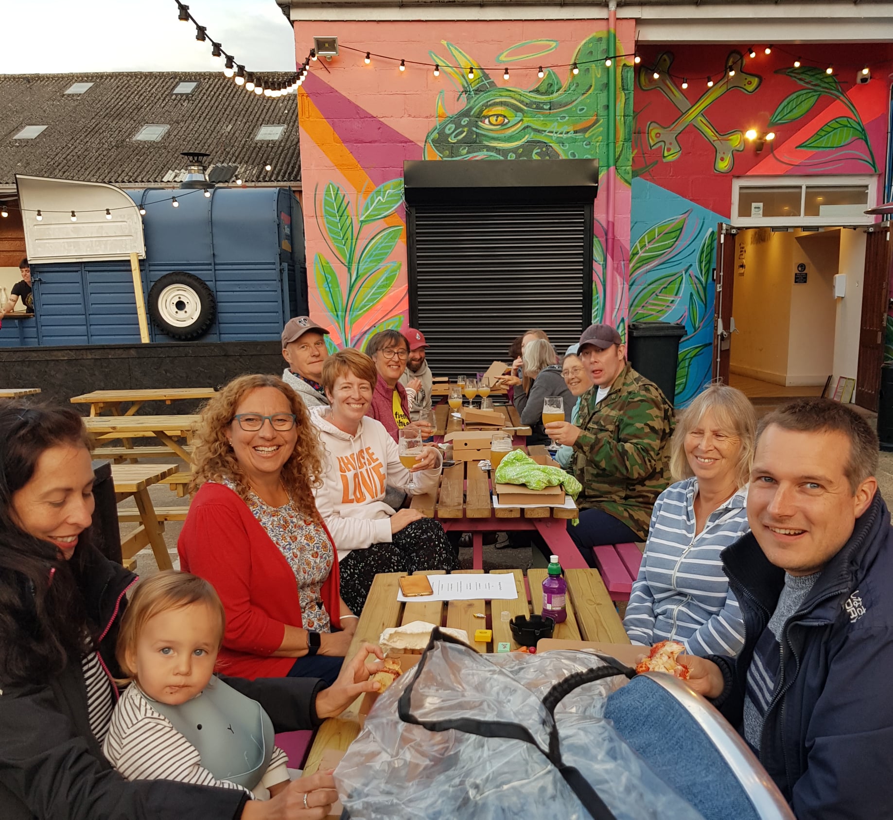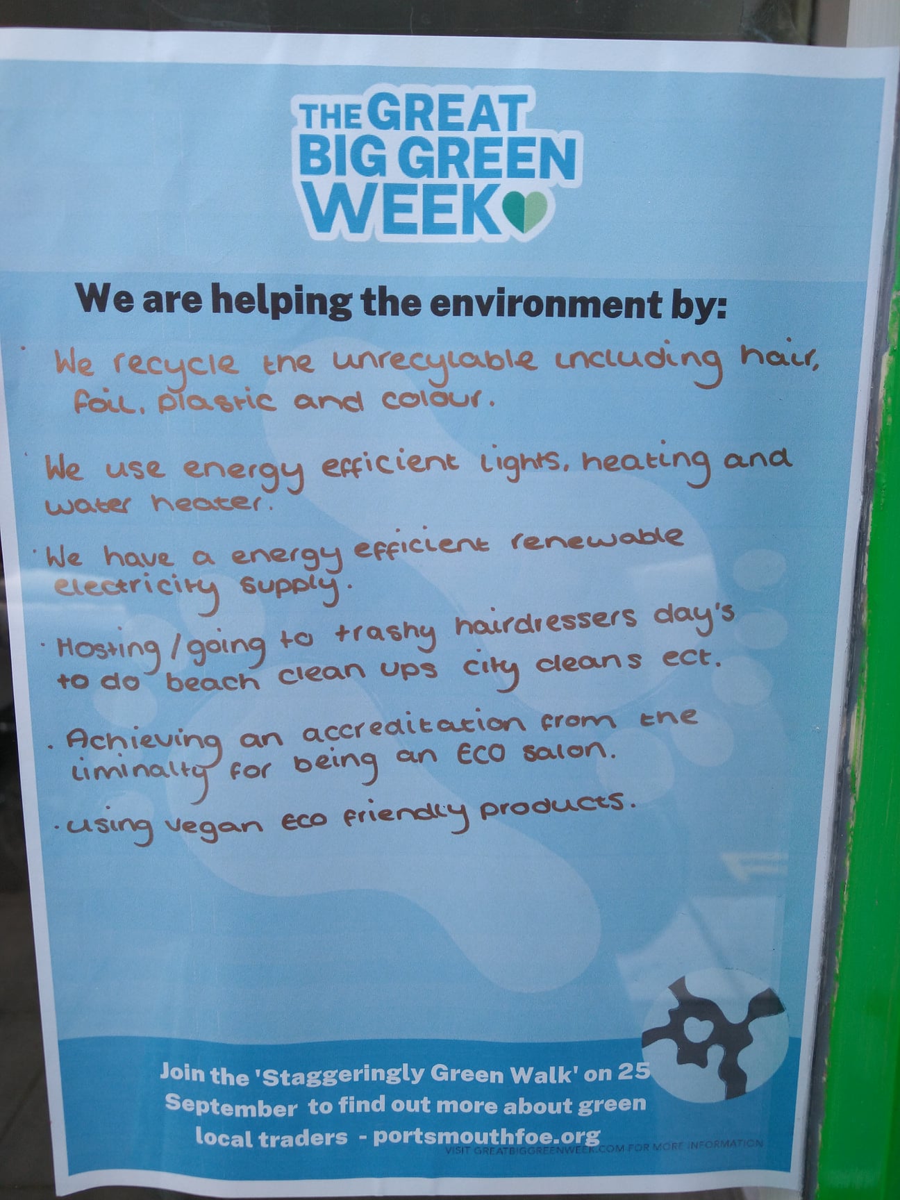 Over 20 people joined PFOE’s ‘Staggeringly Green’ walk to explore what local traders and we as consumers can do to reduce our carbon footprint as part of the Great Big Green Week celebrating action on climate change. Highlights included: Short talks about Package Free Larder & Brambles Infant and Nursery “School Street” experiment; finding out what traders such as Southsea Deli, Southsea Inks and The Green Room Hairdressers are doing to help the environment and why we all need to find ways of reducing our carbon emissions in everything we do; learning about carbon emissions from cut flowers, food, fashion, transport and even funerals; spotting electric car charging points; and enjoying a chat over a drink and a pizza at Staggeringly Good Brewery tap room.